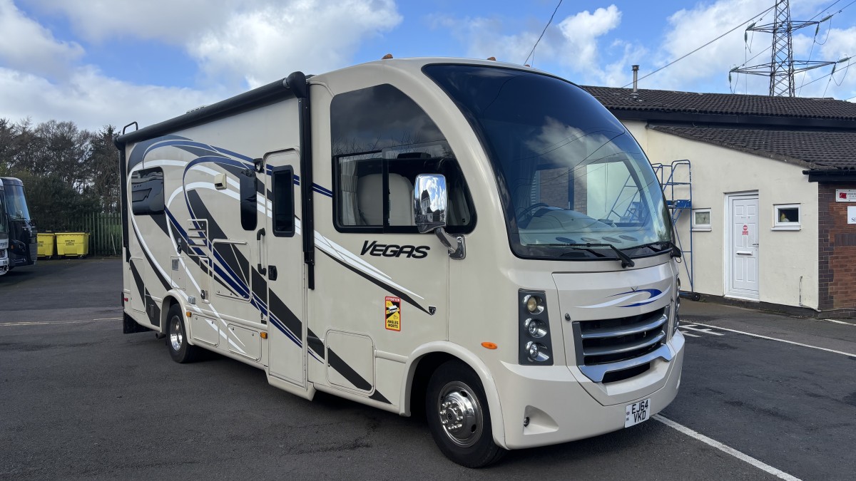 Experience the freedom of the open road with this 2015 Thor Vegas 24.1 American RV, a stylish and compact Class A motorhome that delivers big-RV comfort in an easy-to-drive size. Perfect for road trips, touring, or extended adventures, the Vegas combines smart design with premium features. Powered by a reliable Ford Triton V10 petrol engine, this RV offers smooth performance and plenty of power whether cruising motorways or exploring scenic routes. At just under 25ft long, it’s far easier to manoeuvre and park than larger motorhomes while still providing impressive living space. Inside, the Vegas 24.1 is thoughtfully designed with a modern, comfortable layout. The lounge area features a spacious dinette and swivel captain’s chairs, creating a relaxing social space. A drop-down overhead bunk adds extra sleeping capacity, while the rear bedroom provides a comfortable sleeping area for restful nights on the road. The fully equipped kitchen includes a hob, microwave, fridge/freezer, and ample storage, making it easy to cook wherever your travels take you. The bathroom offers a…