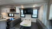 Your family will love traveling in this spacious coach that can sleep six. The little ones will love the drop-down overhead bunk, and you'll have a bedroom with a king bed slide out, a 32" TV, and a large closet to keep your clothes wrinkle-free. The kitchen will be perfect for making at-home meals and there is plenty of counter space to prep fresh fruits and vegetables. Your crew can relax on the Dream Dinette or jack-knife sofa, and there is a 39" TV for movie nights.