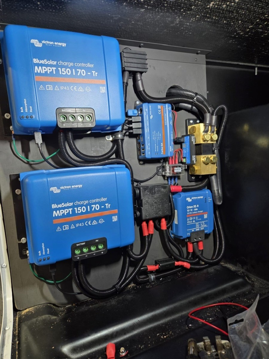 *The above Images show 2 x 628Ah Fogstar Lithium Batteries, over 1800W of roof-mounted Solar Panels and Victron MPPT’s, Smart Shunt, Orion XS B2B Charger and Cerbo GX to optimise Off-Grid Capabilities. All expertly installed by our own on-site technicians. Vehicle is a 2025 Thor Hurricane 29L.*
